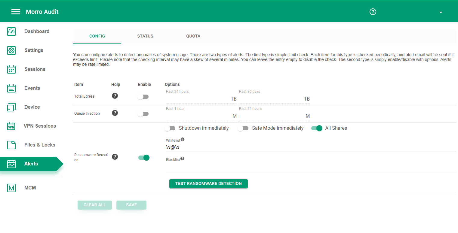 The Analytic->Alerts page allows you to set alerts of "Total Egress", "Queue Injection" and "Ransomware Detection" for Audit enabled shares.