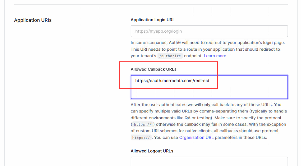 Add Morro's Redirect URL in "Application URL" -> "Allowed Callback URLs", and save.