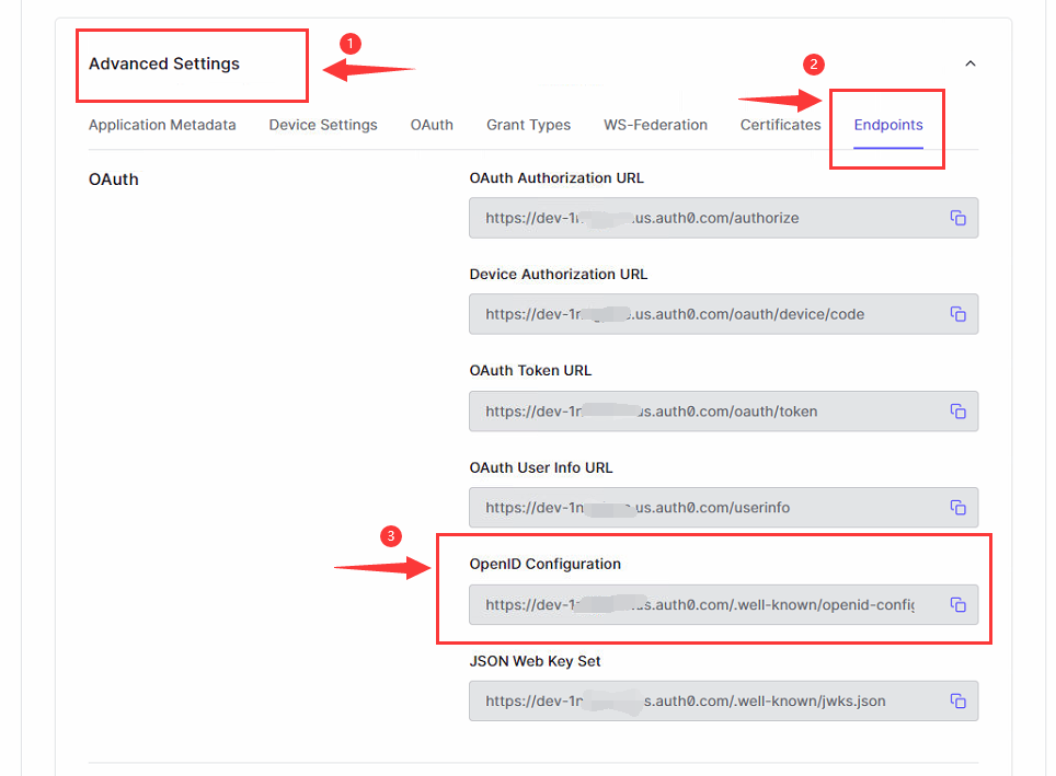 [2] Click "Settings" -> "Advanced Settings" -> "Endpoints", save the Metadata Address from "Open ID Configuration":